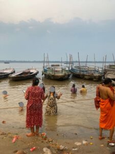 川沿いのガートでは、早朝から沐浴や祈り、火葬が日常的に行われ、生と死が隣り合う独特の風景が見られる。